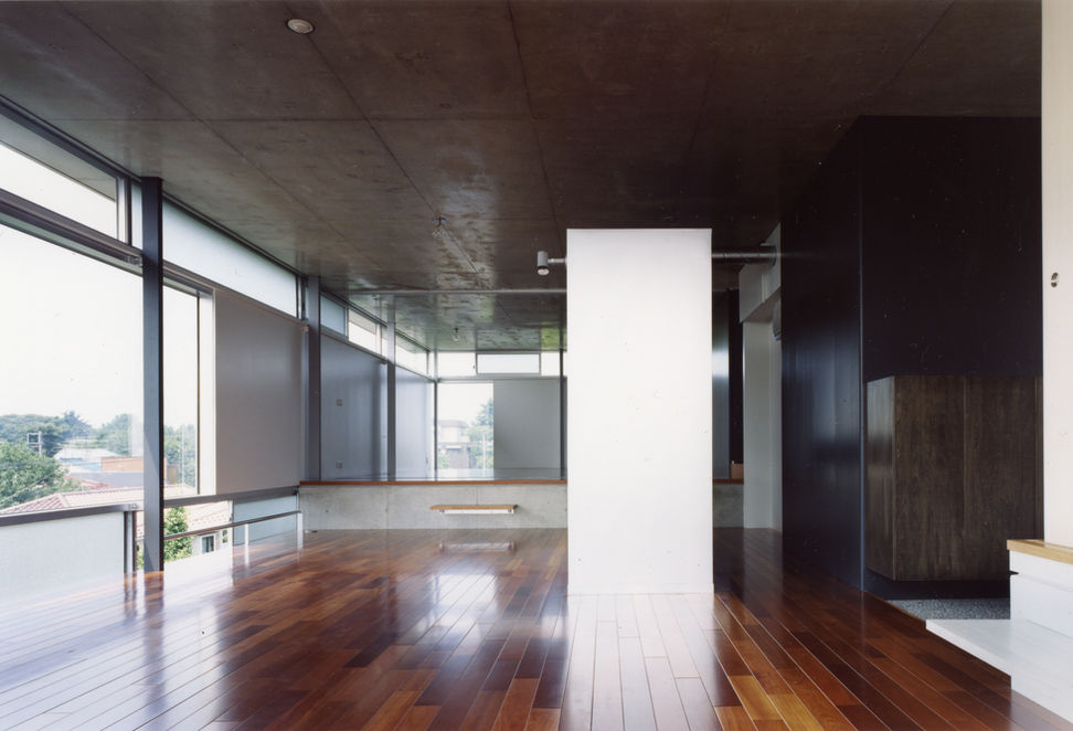 A 5-story building complex with one basement floor and five above-ground floors stacked on thin slabs that spread out flat. Ten residential units, including the owner's residence and office, are allocated in different positions on each slab. On the lower floors, RC unit boundary walls are arranged in a radial pattern from the central atrium, while on the upper floors, steel plate furniture is distributed discretely. There are no structural walls at all on the outer or inner perimeter, and the randomly placed unit boundary walls, steel plate furniture, and flat bars (50 x 100) bear the burden. Each unit (approximately 60 to 180 square meters) is basically a large studio. They can be flexibly partitioned with movable partitions and storage space. All of the exterior surfaces are openings, creating a sense of expansive space on the slab. A large, open space that is continuous with the exterior is created even at ground level, and is “directly connected to the dwelling units through the central atrium via this pilotis.